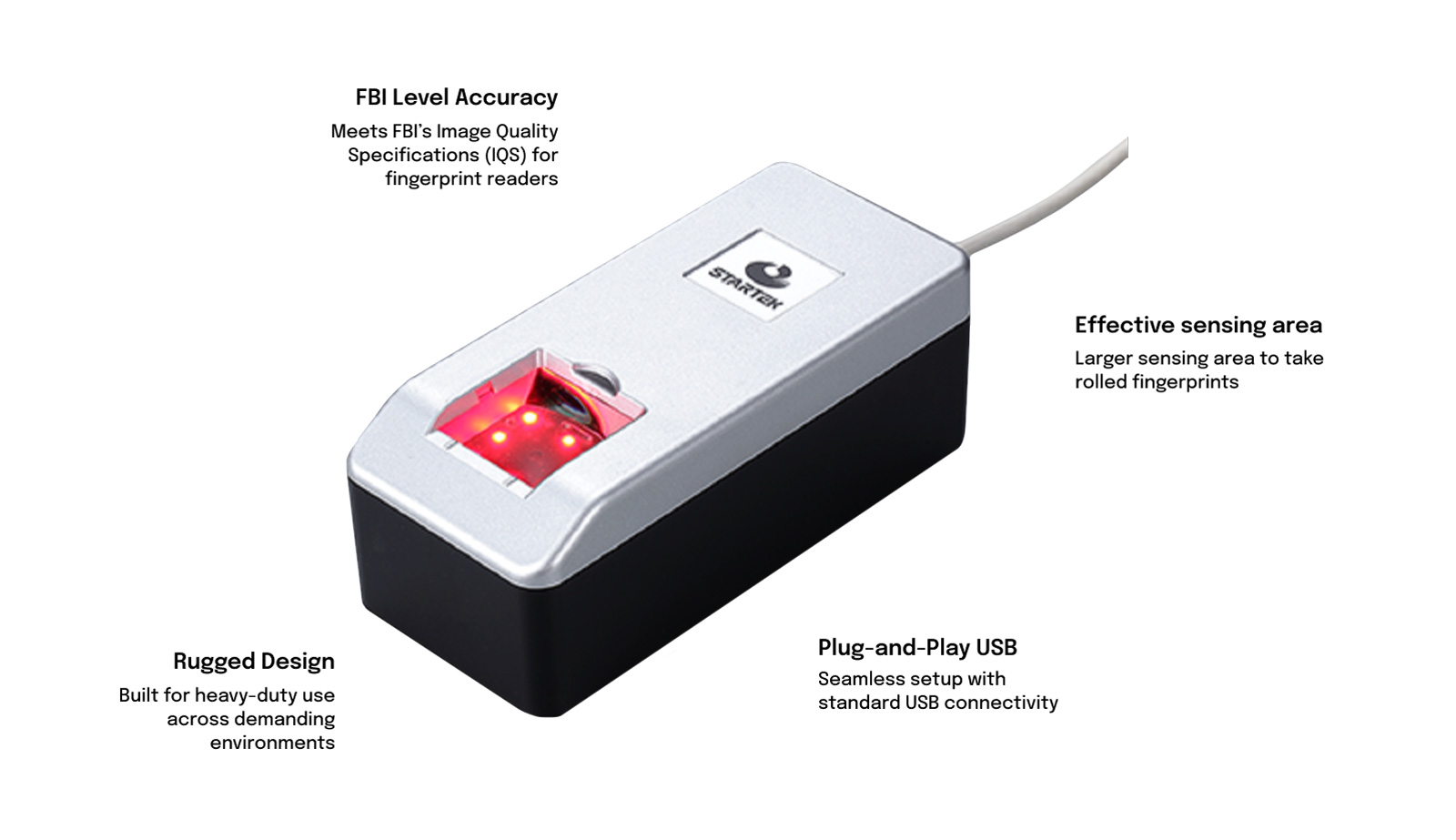 Designed to meet the stringent US government’s image quality level demanded by the FBI's Image Quality Specifications (IQS) for fingerprint readers.