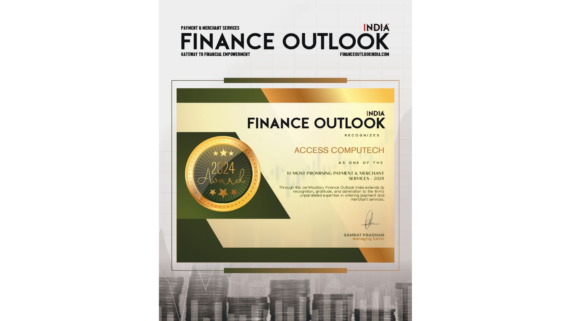 Recognised by Finance Outlook India, Access Computech earns its place among the 10 most promising payment & merchant services companies for 2024.